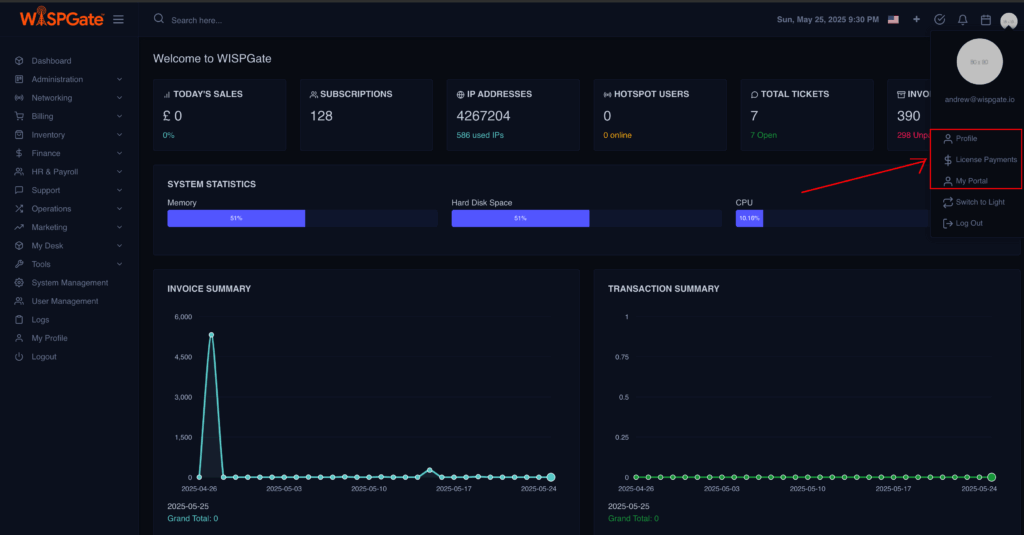 Navigate to the top-right corner of the WISPGate dashboard. Click on your profile icon to reveal a drop-down menu with the following: